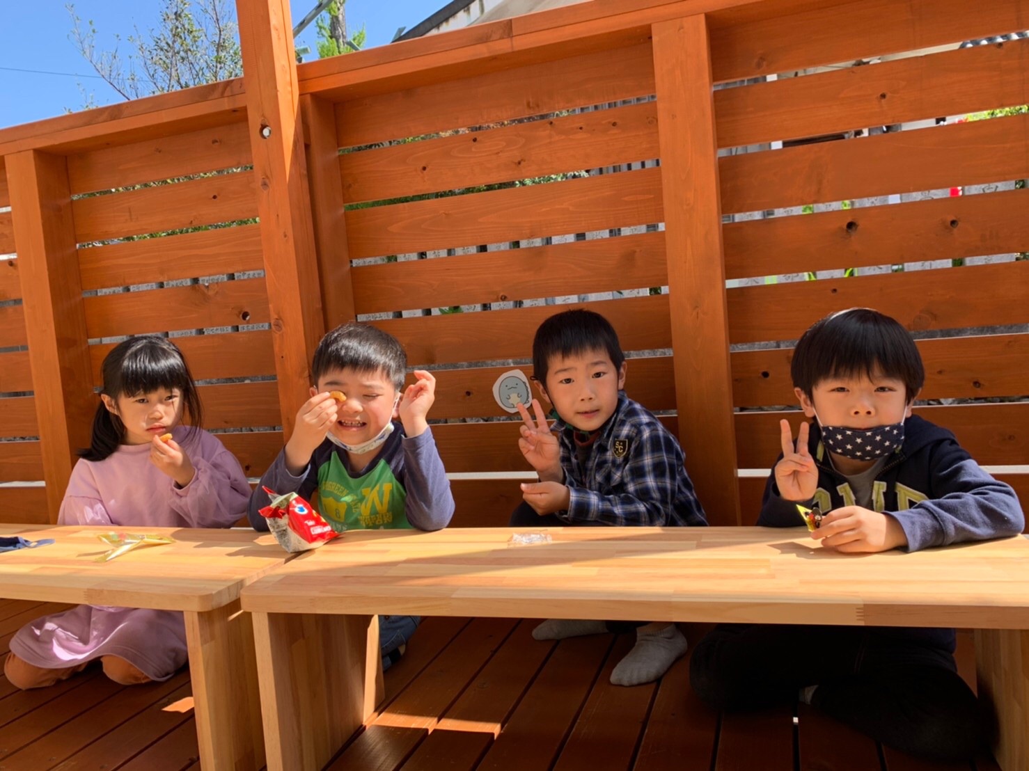 北側のウッドデッキでは、けん玉! 駐車場では、こま回しや縄跳び(^ ^) みんな夢中になっています。